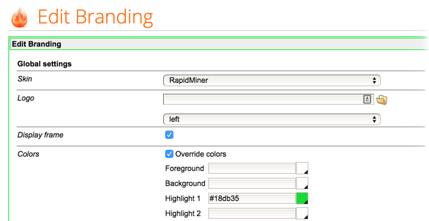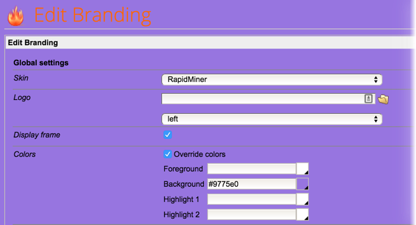 | Skin | Sets the theme for the web app, including color application and frame shading. The RapidMiner skin is applied by default, but there are several predefined skins available through the pull-down. Use the Colors field to further modify the skins. |