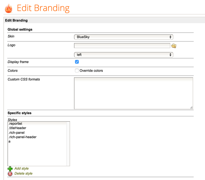 | Custom CSS formats | Adds or modifies CSS class descriptions defined by RapidMiner Server's default CSS. Use your browser's element inspection tools to find element class names or paste in existing CSS descriptions. Typically you use this method for changing general characteristics (for example, line widths and padding). To modify specific classes, use the Specific style section of the dialog. |