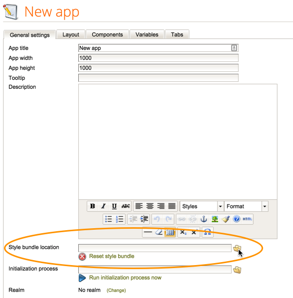You can use your saved style bundles in any new or existing web app. From the New app or Edit existing app window, simply browse to the repository location where the bundle is saved.