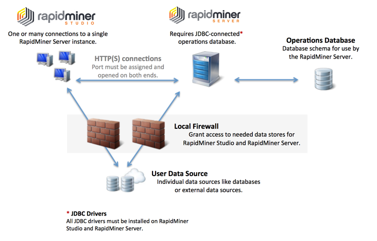 RapidMiner Studio accesses a data source directly and must have access to the data through any local firewalls. RapidMiner Server may access the data source directly or through RapidMiner Studio and also needs firewall access.