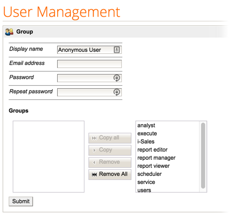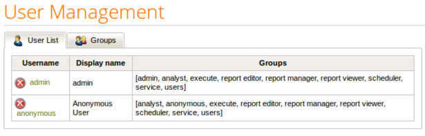 As with any user addition, RapidMiner Server adds user anonymous to all the predefined user groups. To prevent the anonymous user from accessing unintended resources, remove all groups except group anonymous.