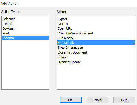 - As Action Type select External and as Action select Set Variable. Click the OK button.