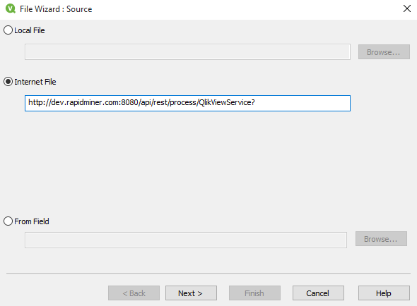 - A new Source window, where the data source is configured, will open. Select the Internet File radio button and insert the direct link of the RapidMiner web service in the text box provided and click Next.