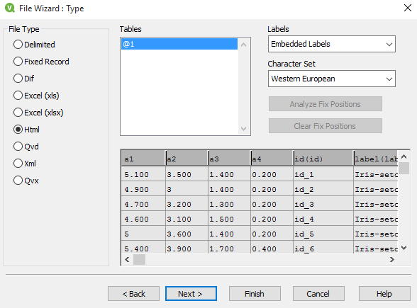- Select Html as File type and (based on your data) choose appropriate Labels and Character Set values. Click the Next button.