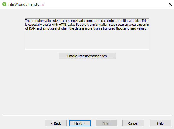 - On the Transform window, click the Next button (as all data have already been transformed and prepared to be read by QlikView).
