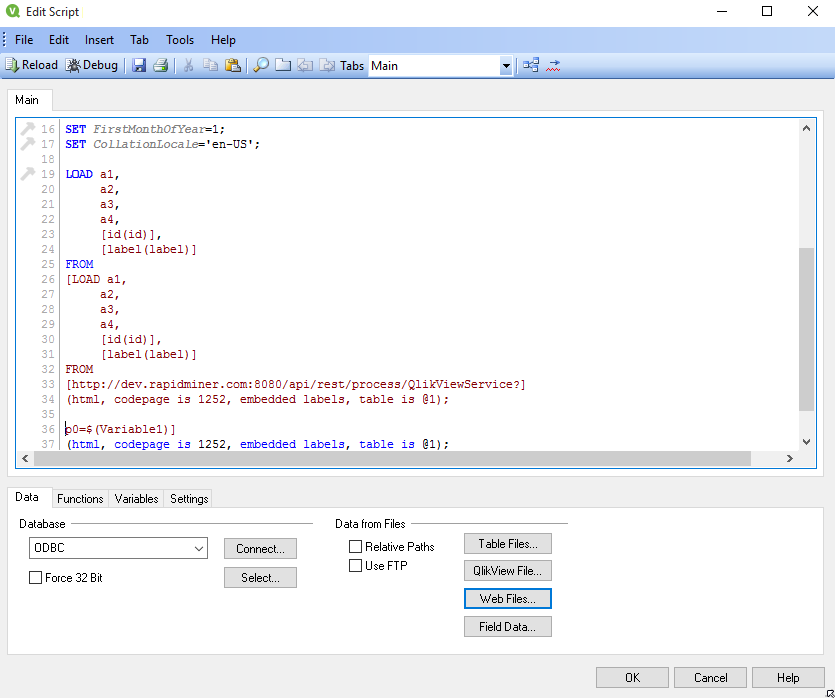 To be able to pass QlikView Variables as parameters to a RapidMiner web service, they have to be defined in QlikView and the data loading script has to be modified to use them.