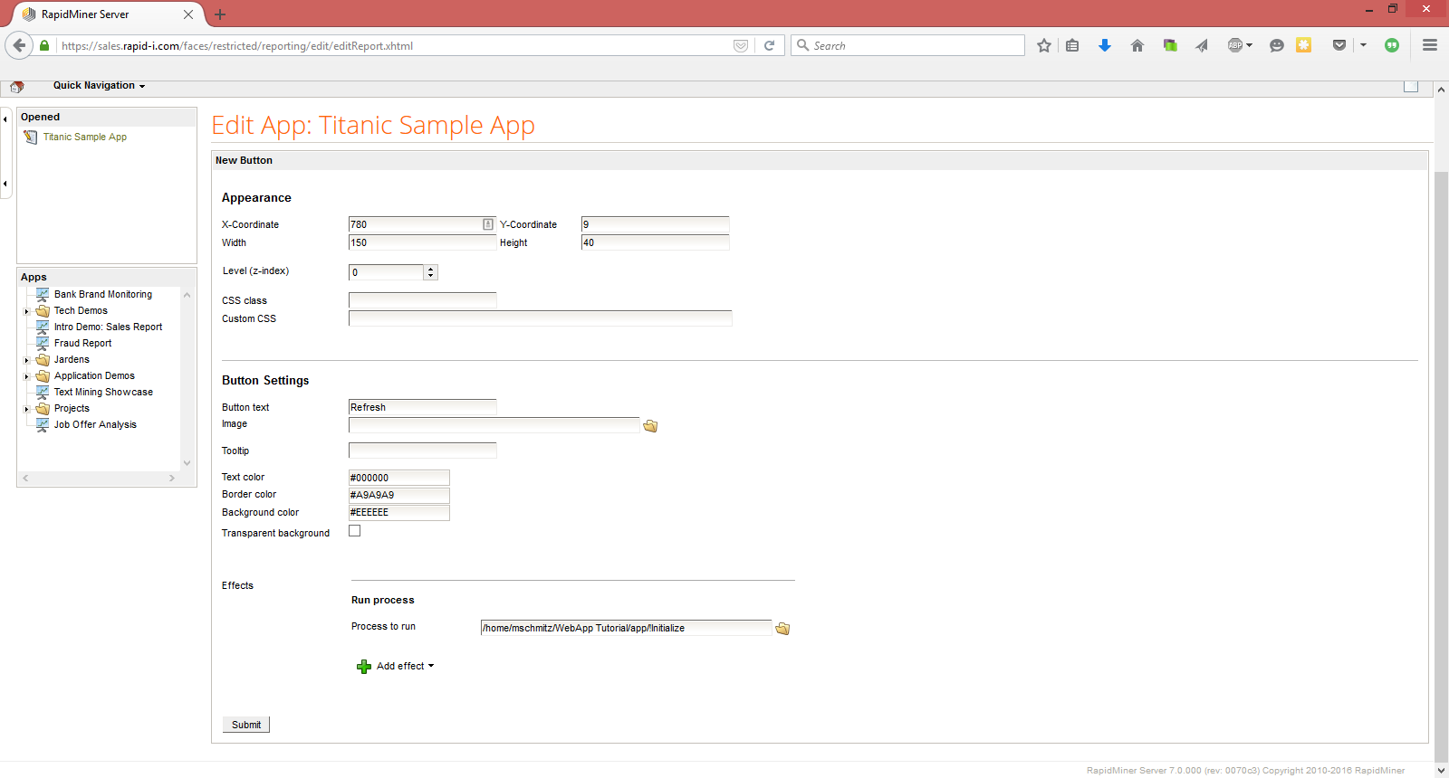 You can give the button a text (and if you want an image). In our case the text will be Refresh. You can add several effects to the click on the button. A effect can be a trigger of a process, a change of an view (tab) or the setting of a variable. In our case we will trigger a process. Please click on Add run process effect in the lower end of the Button menu. Afterwards you can choose the process which should run after clicking on the button. In our case this is the !Initialize process, which republishes all objects. That's it.