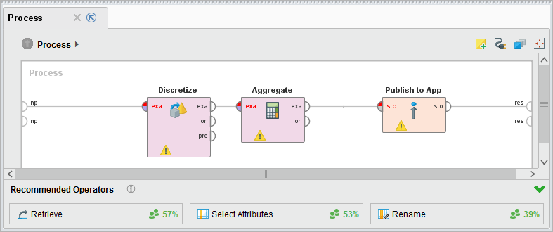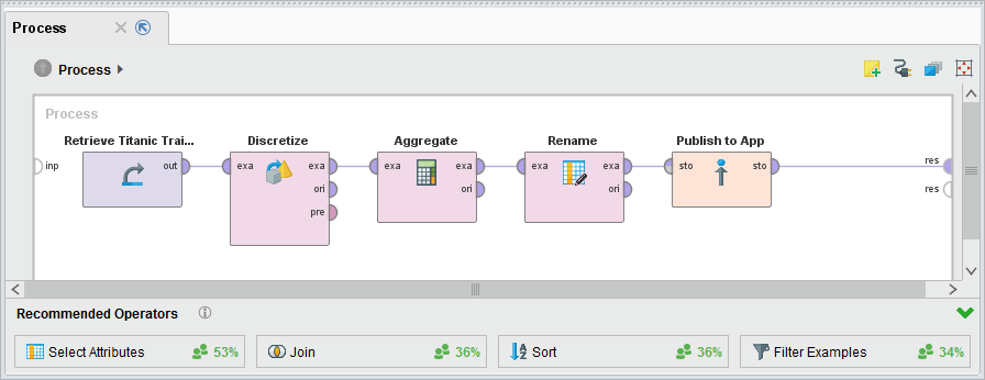 To do this we simply use an Aggregate operator that calculates count of Survived and groups by Survived. For visual reasons we can rename count(Survived) to count. The resulting table will be published to app as Main::PieChartData.