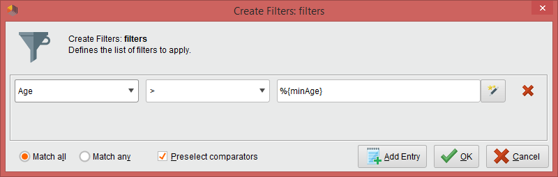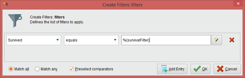Having this setup, we need to add the filter in our created Filter Table process. First we need to introduce a new macro into that process – survivalFilter. Afterwards we need a Branch operator. The Filter should only happen if we did select something. So we choose as condition type for the branch an expression and use %{survivalFilter}=="All" as expression. If we have selected All, we want to do nothing. If we set something we would like to filter for it. This results in this setup