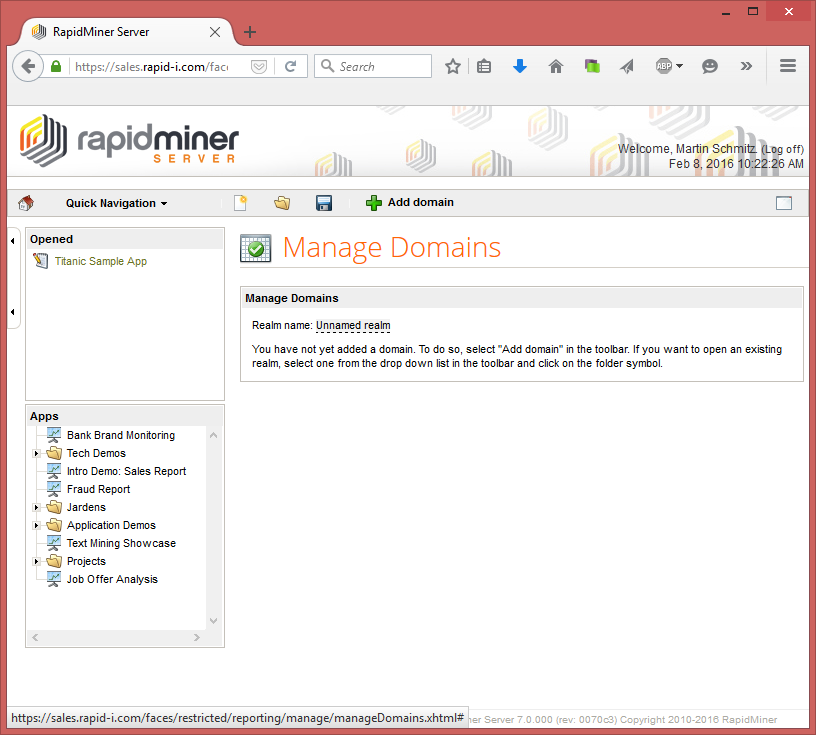 As a next step we will first create a variable and then use this variable to filter our main table. We would like to create a variable called Age which is a positive Integer. To do that we first need to create a realm. To do that go to the upper left and choose Quick Navigation in the upper panel. Please choose Manage Domains in the drop down. Afterwards click on the new button in the upper panel. This will lead you to the generation dialogue for new realms