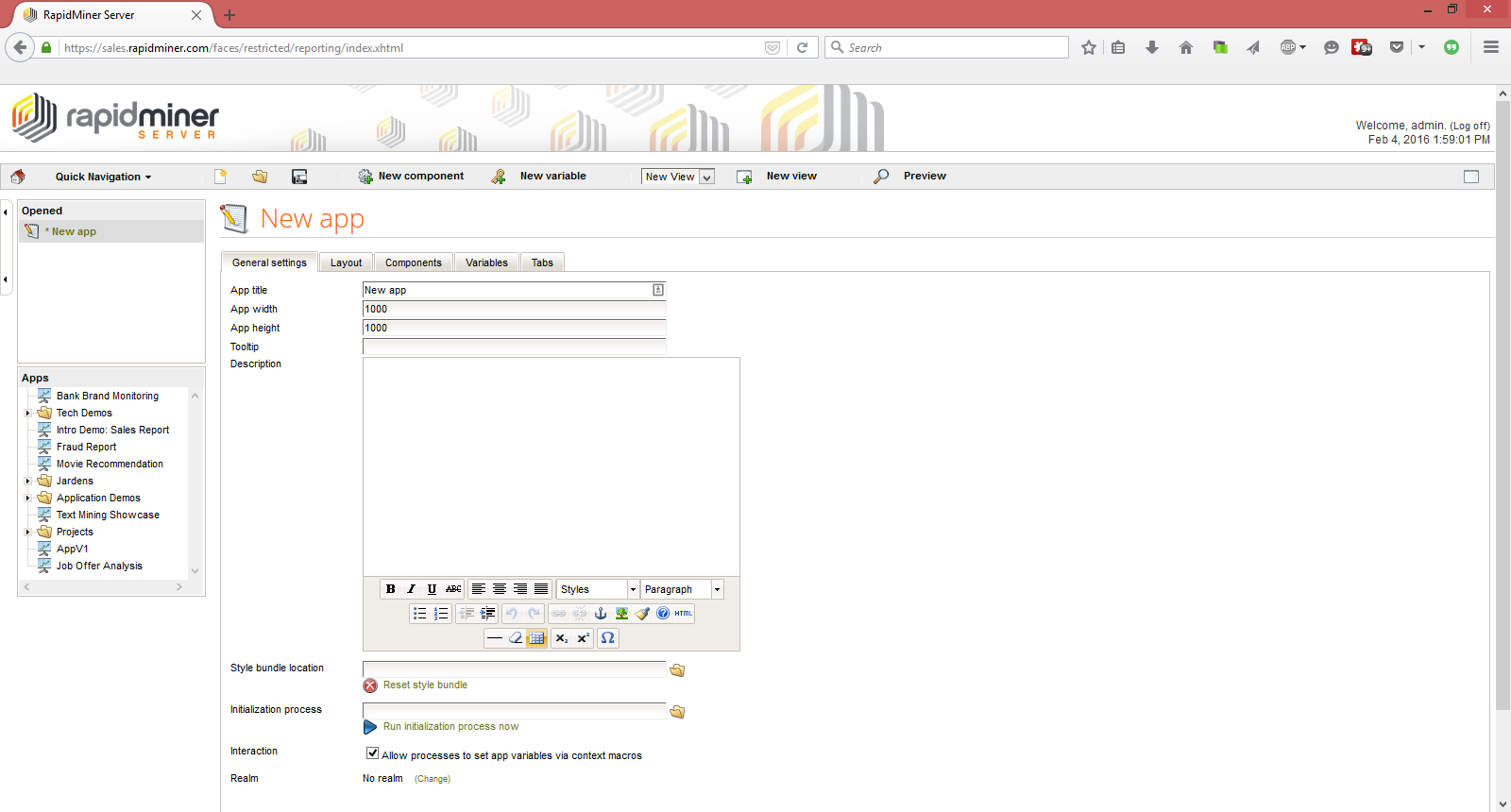 Be sure to save this process. We are now done on the Studio side. Let's move to the server. Please rerun the initialization process by clicking on the blue arrow right next to the location of initialization process. After doing so move to the Layout tab. In this tab we can arrange different visualization components. The components of a dashboard are available by clicking on the New component button in the upper panel.