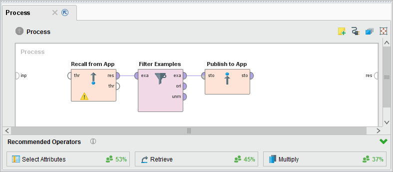The running process blocks any further user interaction in the app. If you have processes which run longer than a few seconds, you might want to run them asynchronously. This can be done using the Schedule Process operator. Please note that app objects published in a scheduled process are not available in an app. A use case for such a construct would be a relearn button.