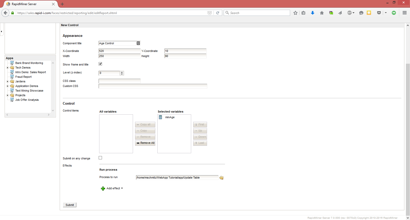 After this being done we can move over to the web interface again. We simply need to create a new component – New user input. Click on the Edit button, like you did before for buttons and visualizations, to configure the behavior. We can add one or, if we have, more variables which can be changed with this panel. Afterwards we can add effects which happen if the user click on submit, or in case of Submit on any change if he changes the value. The interaction will be a Run process and will run our Update Table process.
