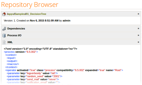Browse through the folder structure to find your process and click on it. (Note that if it is a process you have scheduled or recently executed, you can also find it in the process scheduler.) Related information is displayed including process dependencies, input and output, and XML:
