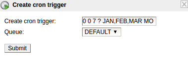 The Create cron trigger dialog opens. Enter a cron expression and click Submit.