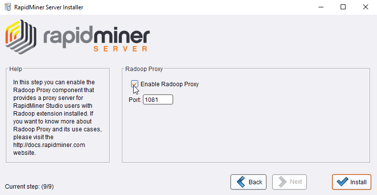 Radoop Proxy can be enabled during the installation of RapidMiner Server or manually later on.