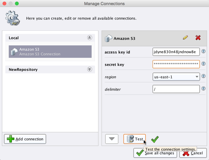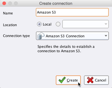 Before you can use the Amazon S3 connector, you have to configure a new Amazon S3 connection. For this purpose, you will need the connection details of your account (at least the access key and the secret key).