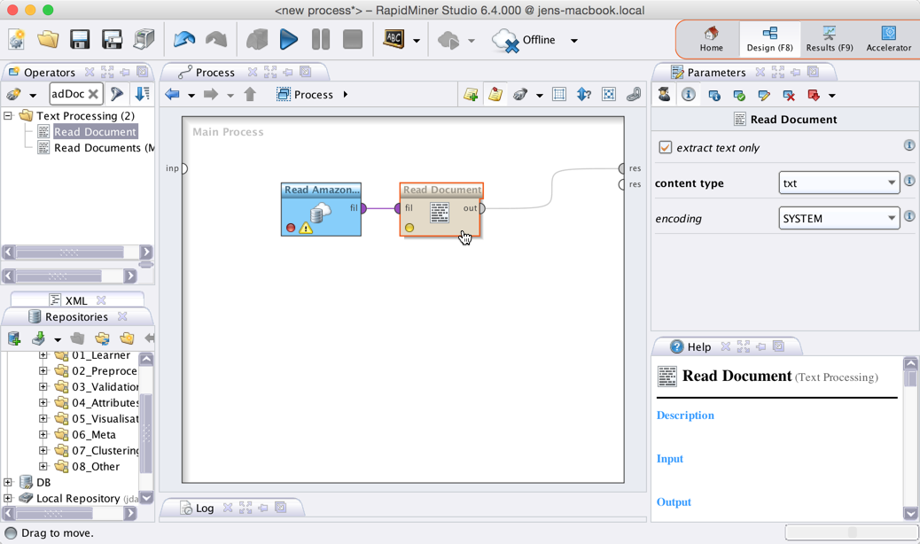 You could now use further text processing operators to work with this document, e.g., to determine the commonness of certain events. To write results back to Amazon S3, you can use the Write Amazon S3 operator. It uses the same connection type as the Read Amazon S3 operator and has a similar interface.