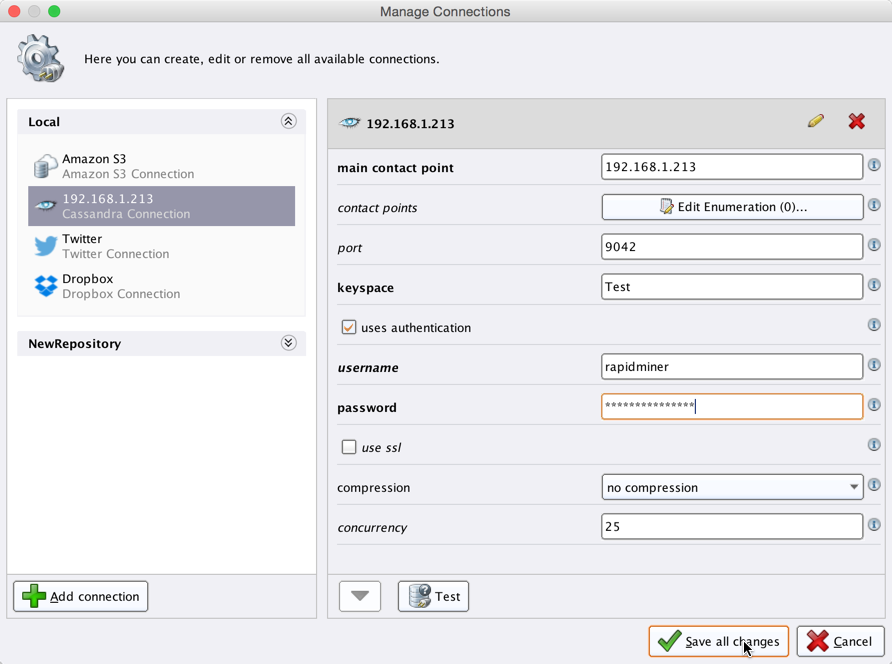 The preconfigured port is the default port used by Cassandra. Note that Cassandra does not require user authentication by default. Optionally, you can test the new configuration by clicking on the