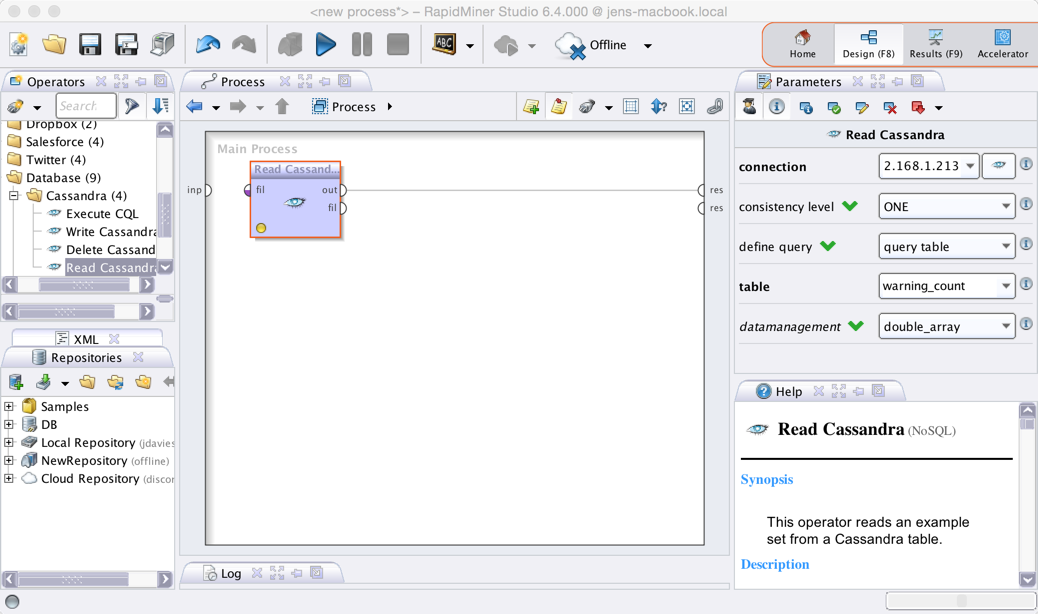 The Cassandra connector allows you to connect to clusters of the NoSQL database Cassandra directly from RapidMiner Studio. It supports all CRUD operations (Create, Read, Update, and Delete), as well as running more sophisticated database commands. This document will walk you through how to: