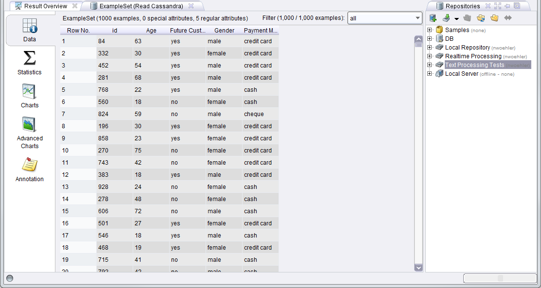 the process! In the Result Perspective, you should see the example set loaded from Cassandra. In our example, the example set contains RapidMiner Studio's Deals sample data set: