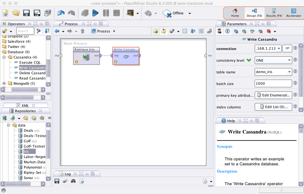in RapidMiner Studio.Drag the Iris sample data set and the Write Cassandra operator into the Process view and connect the operators as shown in the following screen shot. Select your Cassandra connection and enter a name for the new table: