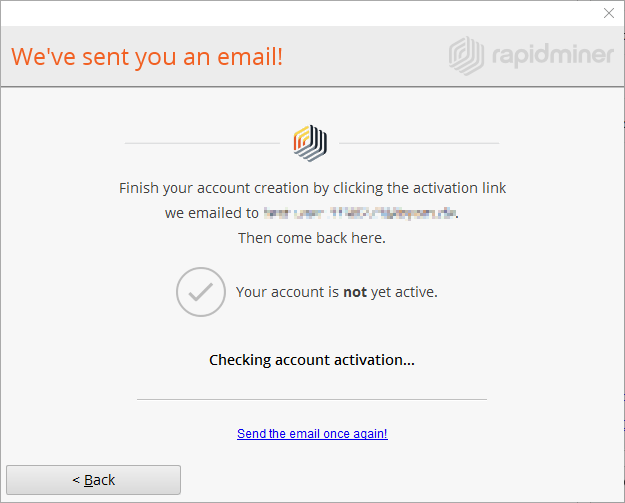 Immediately, the system sends an activation email to the address that you registered. (Allow email from RapidMiner if you do not see an email titled "Verify Your Email" in your inbox.) Periodic checks verify whether your email has been validated.