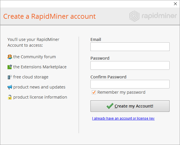 | I already have an account or license key | If you previously registered, enter your rapidminer.com credentials to login so that you can download or install your license(s). |