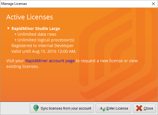 The license server automatically loads your license into RapidMiner Studio. The resulting Manage Licenses screen displays information related to your active license.