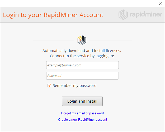 RapidMiner Studio can automatically retrieve the latest license associated with your account if you are logged in to RapidMiner Studio and have an internet connection. If RapidMiner Studio does not have an internet connection (blocked by a firewall, for example), you can also install a license manually.